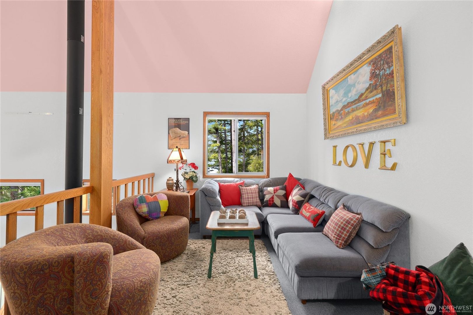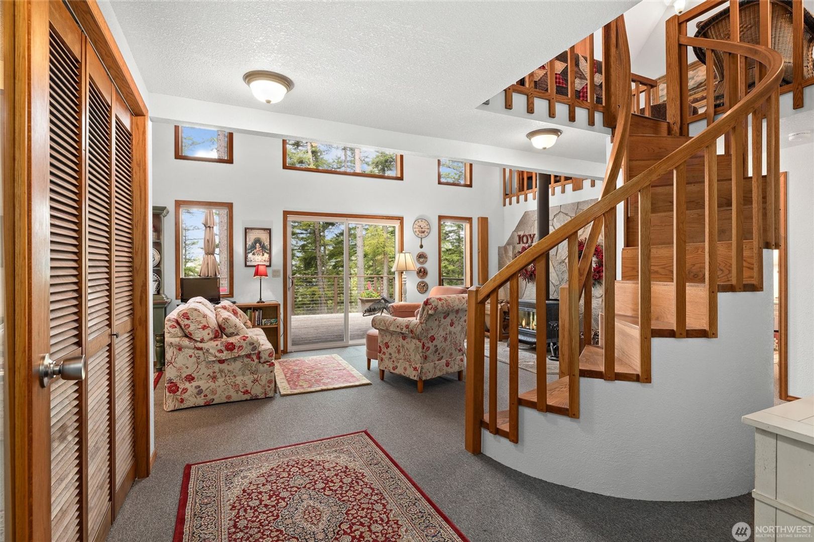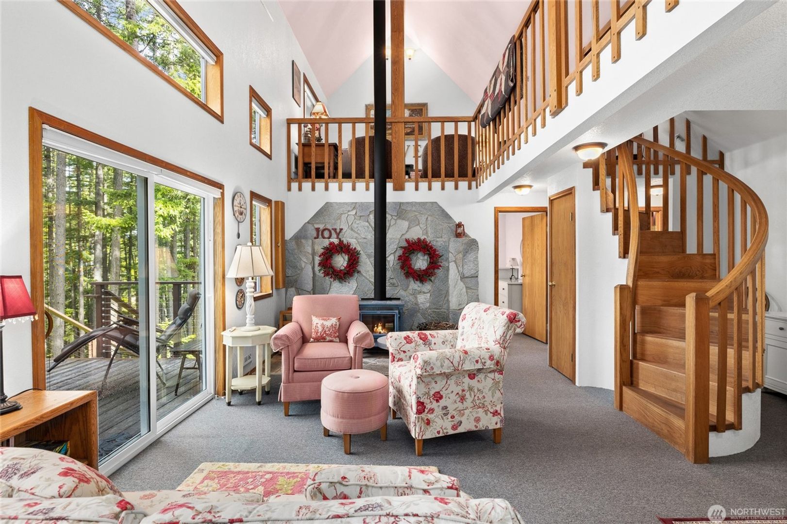 Nice sized living room with stove for heat, ceiling to floor windows to bring the outdoors in, huge entertaining deck.